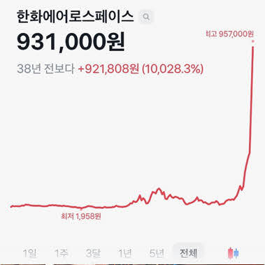 한화에어로스페이스의 올타임 차트입니다. 최근 주목받던 종목 같지만 그건 아닙니다. 물론 최근 상승률은 드라마틱하빈다. 비트코인 차트라고 해도 믿을 정도죠. 그만큼 좋은 주식의 상승률은 높습니다.