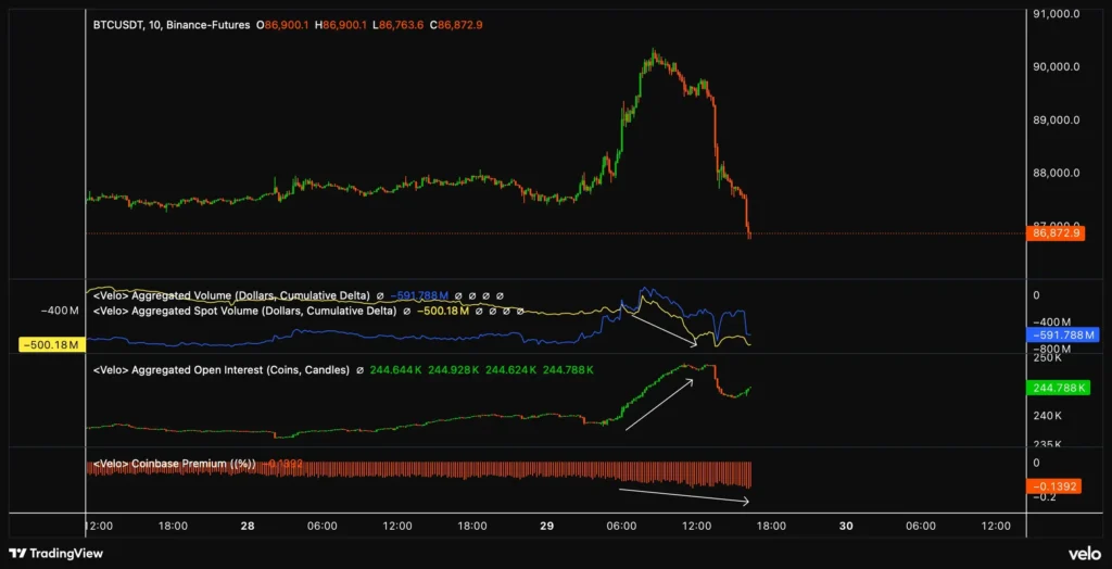 흥미로운 점은 미결제약정은 오히려 급증했다는 사실입니다. 새로운 롱과 숏 포지션이 대거 진입했다는 뜻인데, 강력한 현물 매도세 때문에 가격은 반전되었습니다. 결국 뒤늦게 들어온 신규 롱 포지션들은 물려버리고 만 것입니다.