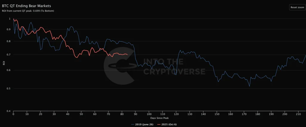 하지만 중요한 건 이번 하락이 2017년이나 2021년처럼 광기 어린 상승 끝에 찾아온 맹렬한 하락과는 성격이 다르다는 점입니다. 급격한 붕괴가 아니라 천천히 힘을 빼는 조정이라는 분석입니다.